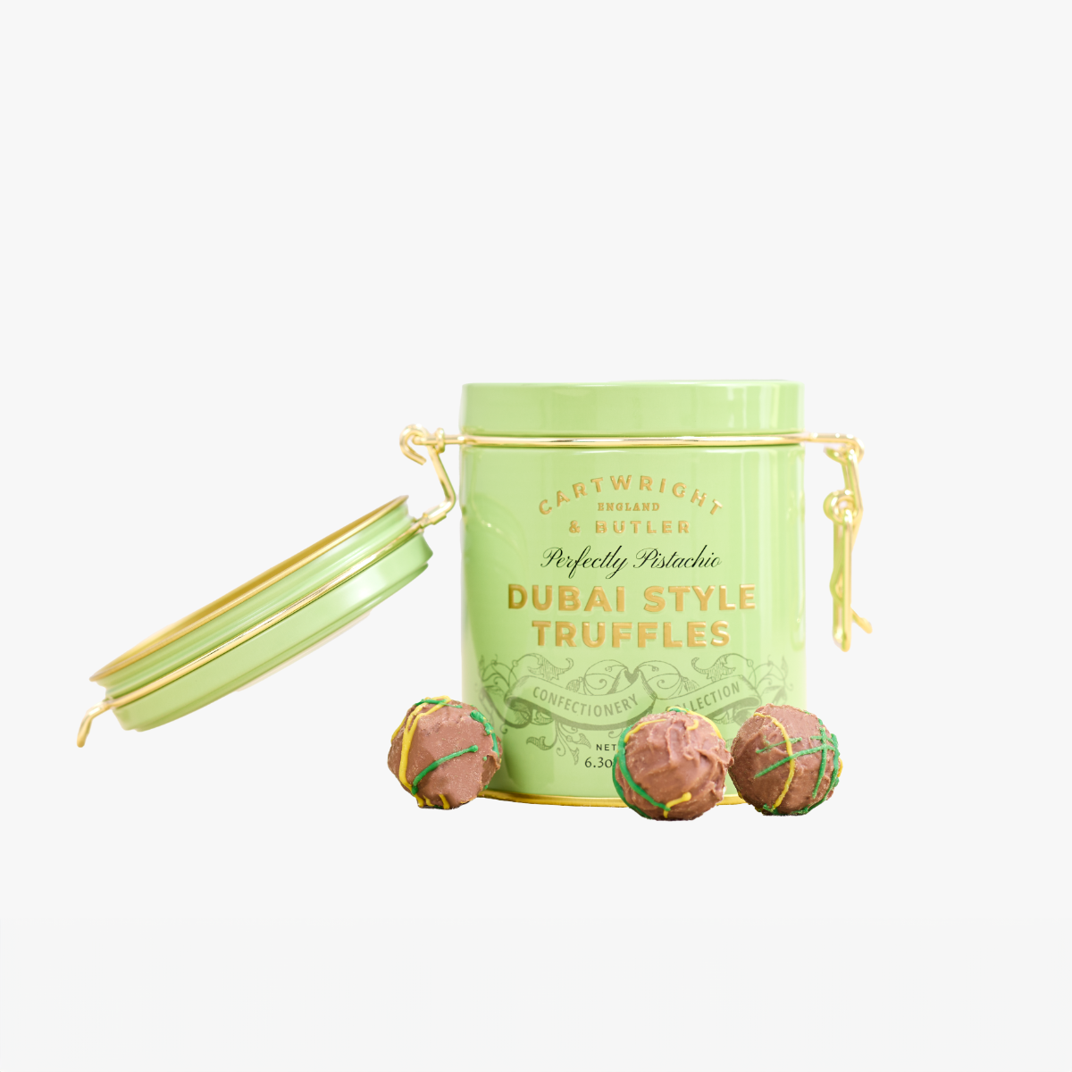 Melt-in-the-mouth milk chocolate filled with a creamy pistachio ganache, knafeh crunch, and finished with a vibrant yellow and green drizzle.These irresistable Dubai Style Truffles are a new favourite at Cartwright & Butler HQ.