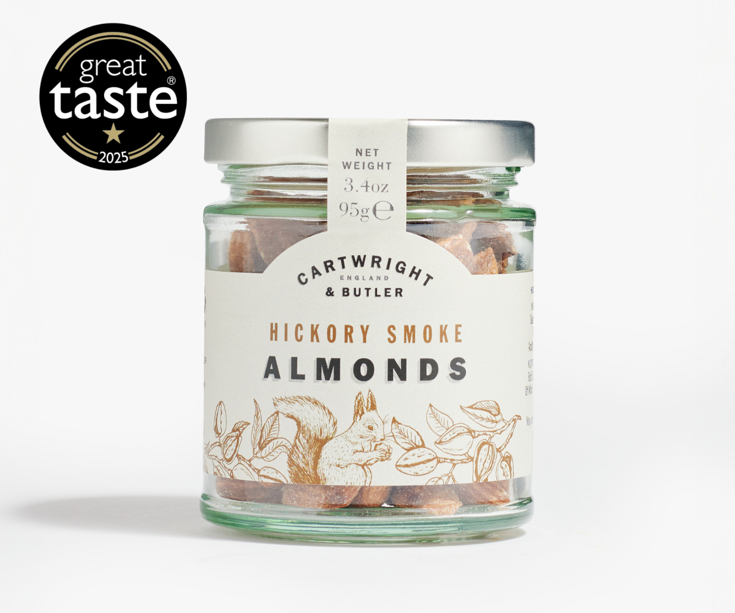 Almonds (94%), Hickory Smoke Seasoning (4%) (Salt, Maltodextrin, Yeast Extract, Dextrose, Smoke Flavouring, Rapeseed Oil, Acidity regulator: Citric Acid), Stabiliser (1.4%): Gum Arabic