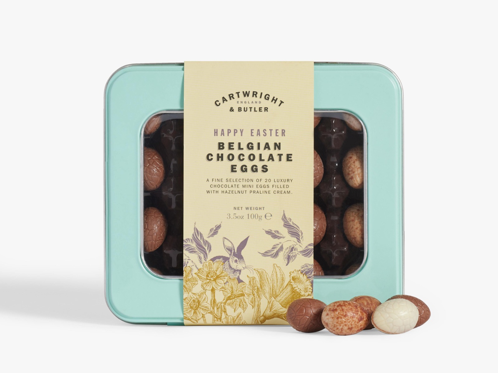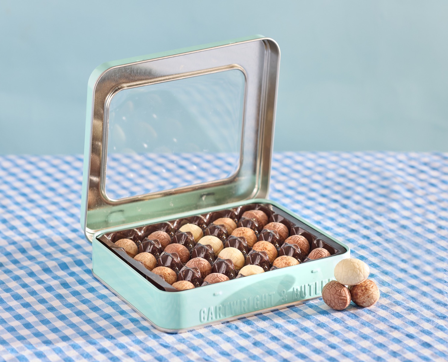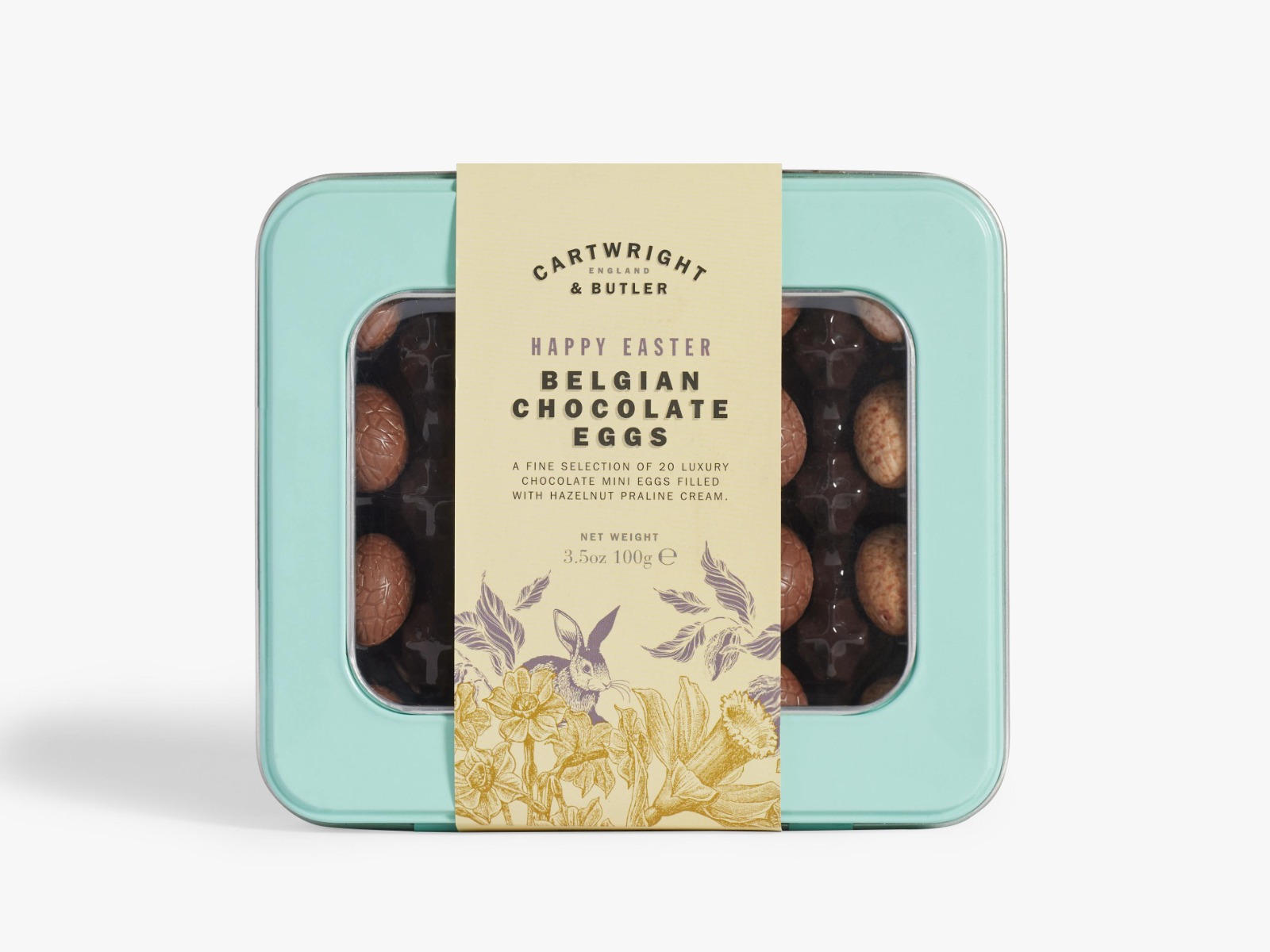 A fine selection of white, milk and dark chocolate eggs with rich praliné cream filling which deliver a truly velvety taste. Whether it is for a gift, to share, or something purely for self-indulgence, our brand new mini Luxury Belgian Chocolate Eggs are displayed in this wonderful green window tin, which can be used time and time again.